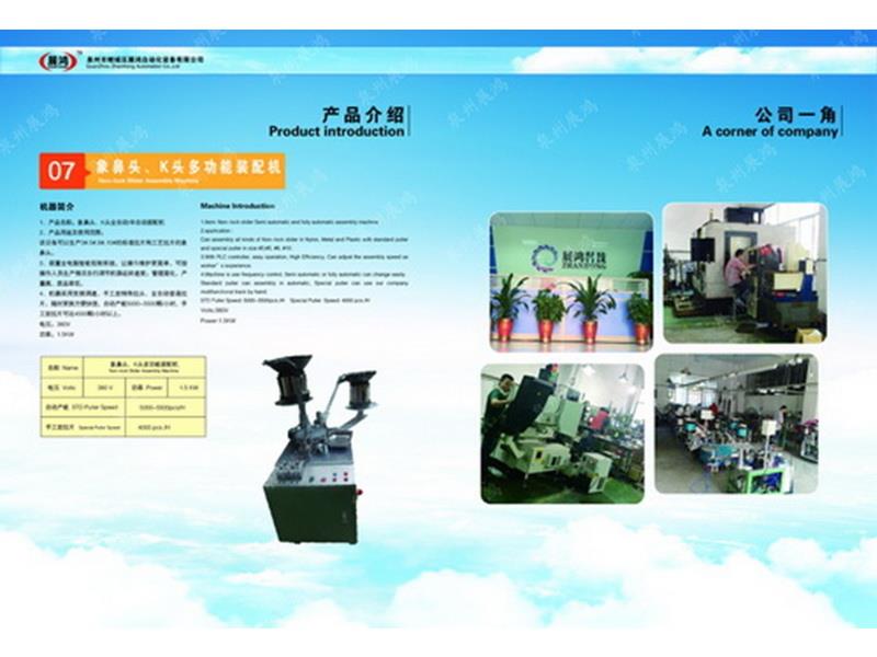 ??泉州市展鴻自動化科技有限公司始創(chuàng)于2003年,是一個集研發(fā)、制造、銷售為一體的現(xiàn)代化公司,專業(yè)從事研發(fā)、生產(chǎn)各類型號的全自動拉鏈頭裝配機(jī)。泉州市展鴻自動化科技有限公司始創(chuàng)于2003年,是一家集研發(fā)、生產(chǎn)、銷售、服務(wù)于一體的現(xiàn)代化拉鏈頭設(shè)備智能制造生產(chǎn)企業(yè):專業(yè)從事研發(fā)、生產(chǎn)各類型號的全自動拉鏈頭智能裝配機(jī)。亦可根據(jù)不同客戶的需求,提供適合客戶自身需要的“私人定制”式專用拉鏈頭設(shè)備及自動檢測拉頭品質(zhì)一體機(jī)。泉州市展鴻自動化科技有限公司始創(chuàng)于2003年,是一家集研發(fā)、生產(chǎn)、銷售、服務(wù)于一體的現(xiàn)代化拉鏈頭設(shè)備智能制造生產(chǎn)企業(yè):專業(yè)從事研發(fā)、生產(chǎn)各類型號的全自動拉鏈頭智能裝配機(jī)。亦可根據(jù)不同客戶的需求,提供適合客戶自身需要的“私人定制”式專用拉鏈頭設(shè)備及自動檢測拉頭品質(zhì)一體機(jī)。